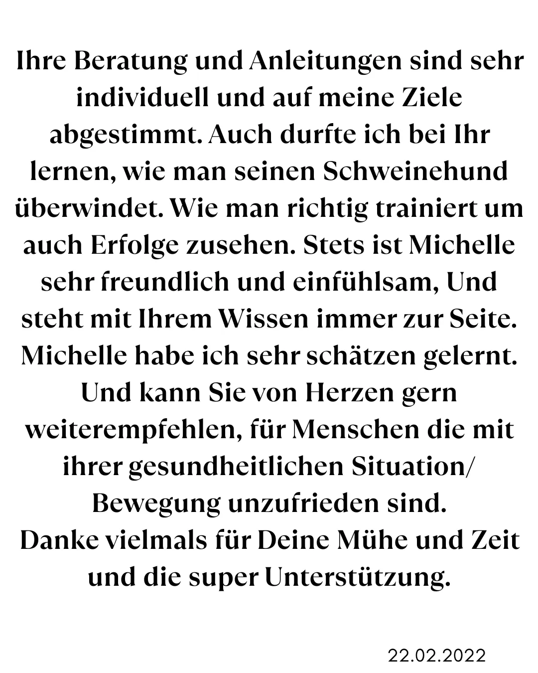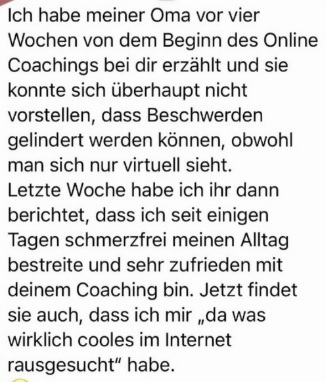 60 bis 90 Minuten herausfinden was die Ursachen sind und exklusiv unter genauer Anleitung Übungen für den Alltag erlernen